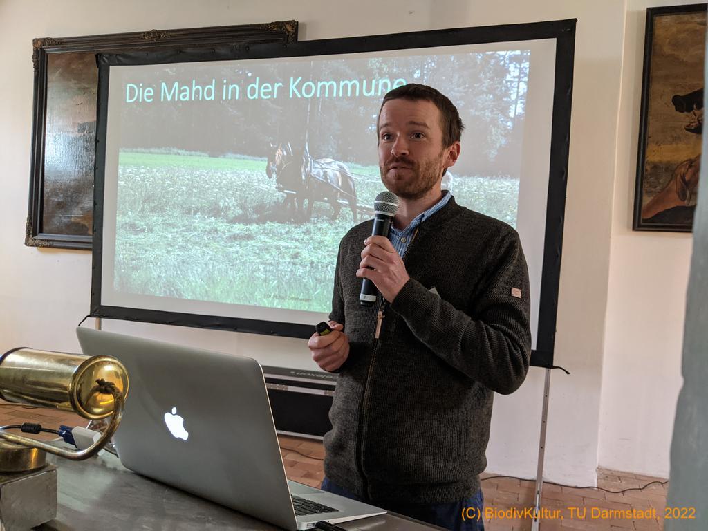 Prof. Dr. Nico Blüthgen ist Projektleiter des Projekts BioDivKultur und hielt an beiden Workshoptagen einleitende Vorträge über den Insektenrückgang, zeigte eigene wissenschaftliche Ergebnisse und den Einfluss der Mahd auf Insekten. Zu Beginn seiner Vorträge zeigte er die faszinierende Vielfalt der Insekten anhand seiner eigenen Makroaufnahmen, die er regelmäßig auf iNaturalist hochlädt. Auch erklärte Nico Blüthgen, dass der Einfluss der Mahd unterschiedlich auf Wiesenbewohner (Bsp. Heuschrecke) als auf Wiesenbesucher (Bsp. Bestäuber wie Schmetterlinge) wirkt. Am zweiten Mahworkshoptag gab Nico Blüthgen einen Hinweis auf die Studie Seibold et al. (2019) zum Rückgang von Insekten und dem Zusammenhang zur Landnutzungsintensität (https://doi.org/10.1038/s41586-019-1684-3). Neben dem nachgewiesenen Rückgang von Arten und Individuen der Insekten zeigte sich auch, dass die Präsenz von viel Ackerfläche einen noch stärkeren negativen Einfluss auf die Grünlandbewohner hatte. Die Ergebnisse bieten Handlungsmöglichkeiten, z.B. die Landschaft als Ganzes mit Randstrukturen zu begreifen.