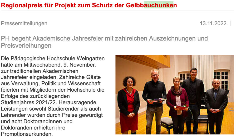 Die Gelbbauchunke ist nach dem Bundesnaturschutzgesetz streng geschützt. Baden-Württemberg liegt im Zentrum ihres natürlichen Verbreitungsgebietes, aber ihre Population ist stark bedroht. Deshalb hatten sich Professorin Dr. Dorothee Benkowitz, Professor Dr. Johannes Huwer, Professor Dr. Holger Weitzel, Dr. Philipp Unterweger und Cathrin Hummel aus den Fächern Biologie und Chemie entschlossen, zusammen mit Schülerinnen und Schülern, ihren Lehrerinnen und Lehrern sowie Lehramtsstudierenden der PH Weingarten an vier ausgewählten Schulen in Oberschwaben Biotope anzulegen, in denen die Gelbbauchunken leben, laichen und sich vermehren können. Dazu wurde ein Unterrichtskonzept für Grund- und Sekundarschulen entwickelt, mit dem am Beispiel der Gelbbauchunke Leitziele der Bildung für nachhaltige Entwicklung (BNE) exemplarisch vermittelt werden konnten. Außerdem wurden in Hochschulseminaren und Lehrkräftefortbildungen Multiplikatoren ausgebildet, die das Projekt an eine möglichst große Zahl an Schulen weitertragen können. Somit dient dieses Projekt nicht nur dem Artenschutz sondern auch der Bildung von Schülerinnen und Schülern im Hinblick auf Artenschutz, Biodiversität und Nachhaltigkeit.